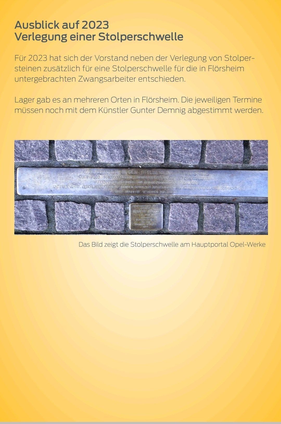 Für 2023 hat sich der Vorstand neben der Verlegung von Stolpersteinen zusätzlich für eine Stolperschwelle für die in Flörsheim untergebrachten Zwangsarbeiter entschieden.