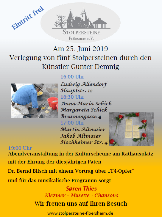 Am 02. Februar 2017 fasste der Magistrat der Stadt Flörsheim am Main den Beschluss, sich an der bundesweiten Aktion des Künstlers Gunter Demnig zu beteiligen und in Flörsheim ebenfalls Stolpersteine – gegen das Vergessen der Greueltaten während des Holocaust, zu verlegen.